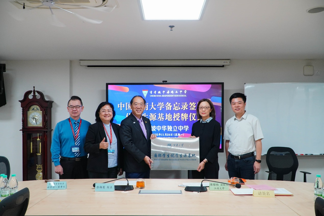 马来西亚有着海外最完善的华文教育体系,历经百年风雨而薪火相传,华文中学培养的学生汉语流利、品学兼优、多才多艺,是优质国际学生的重要来源。代表团一行先后走进有着百年办学历程的吉隆坡中华独立中学、槟城锺灵独立中学,举行“江南大学国际优质生源基地”签约和授牌仪式。张影陆为校方介绍了学校的基本情况、办学规模、育人理念,指出马来西亚现已成为我校第三大学历生生源国,希望与优秀的华文中学友好共建,通过“学术适配、政策激励、校园支持”三维发力,加强对马来西亚学生来华学习的吸引,拓宽优质生源渠道,以教育合作促民心相通。代表团一行还与学生代表见面,国际交流合作处副处长王胤当场为高三学生宣介学校的招生政策。