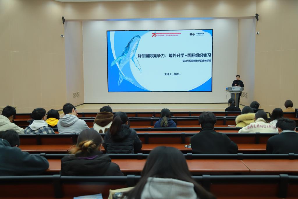 为帮助学生深入了解国际化人才培养路径,拓宽升学与职业发展视野,12月4日,我校在第一教学楼举办解锁国际竞争力:境外升学+国际组织实习—搭建从校园到全球的成长桥梁分享讲座。本次讲座邀请到高层次国际化人才培养创新实践项目国际关系主任范纯一担任主讲,吸引了全校各专业100余名学生参与。