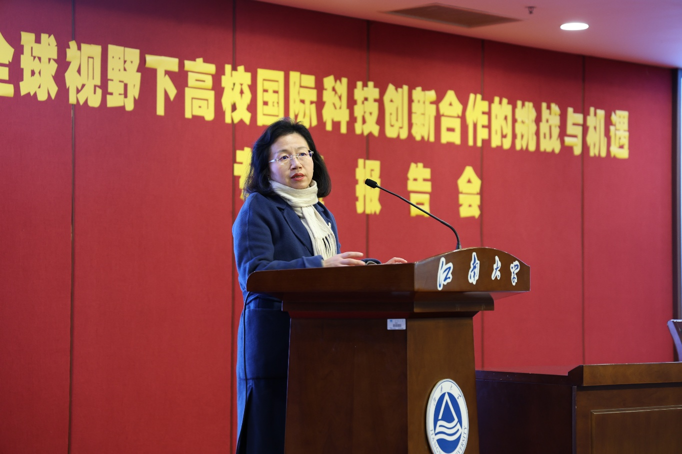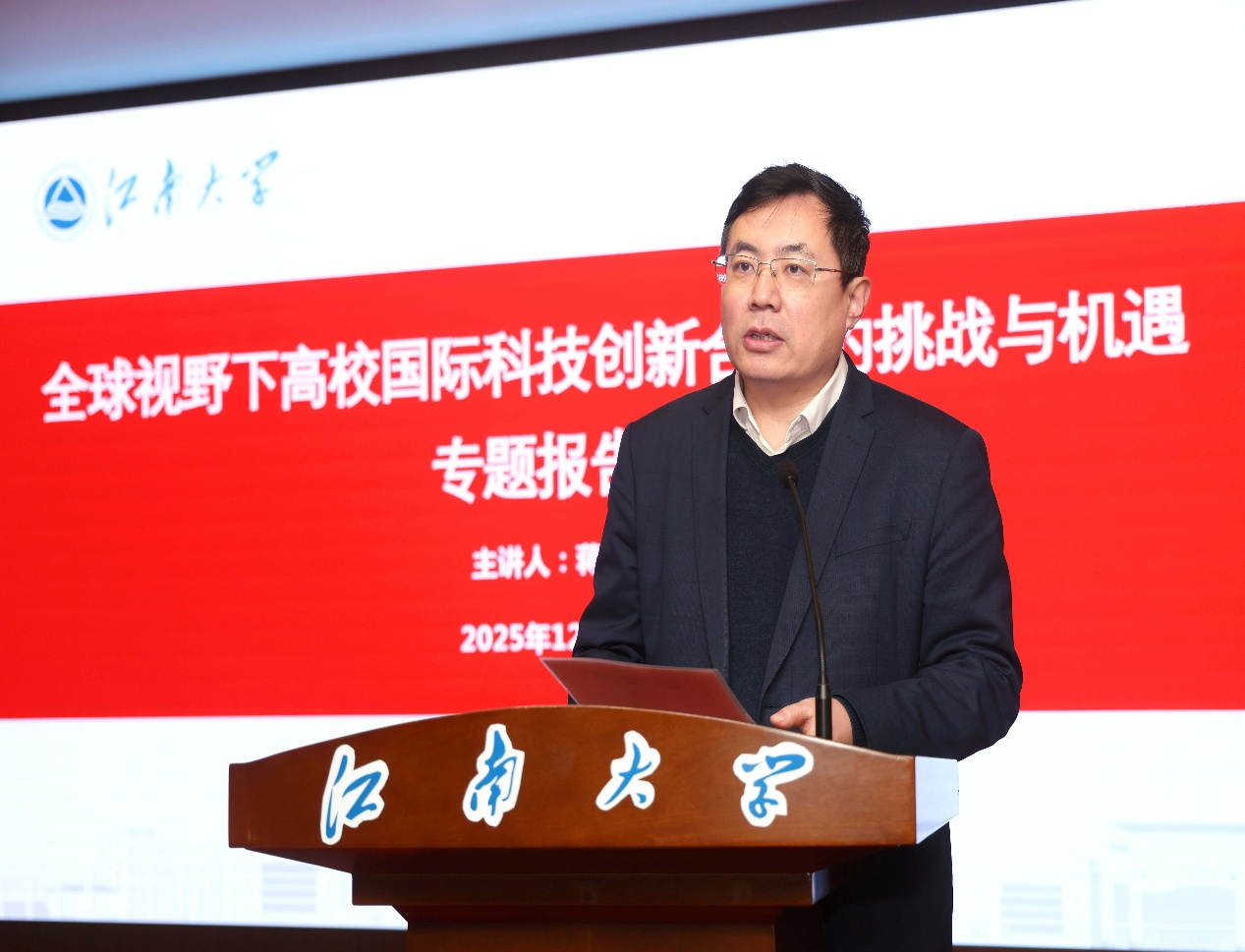 12月22日上午,由国际交流合作处主办的“全球视野下高校国际科技创新合作的挑战与机遇”专题报告会在图书馆五楼报告厅举行。我校78级杰出校友、中国驻英国大使馆原公使衔科技参赞、科学技术部人事司原副司长蒋苏南应邀作主旨报告。报告会由校党委委员、副校长刘龙主持,国际交流合作处及科学发展部负责人、各学院分管国际交流工作的副院长、青年教师、博士后研究人员及研究生等近200名师生代表到场聆听。